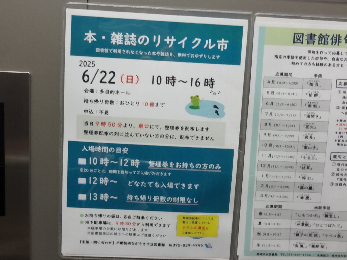 長崎市立図書館で「本・雑誌のリサイクル市」が6/22に開催されるそうですが