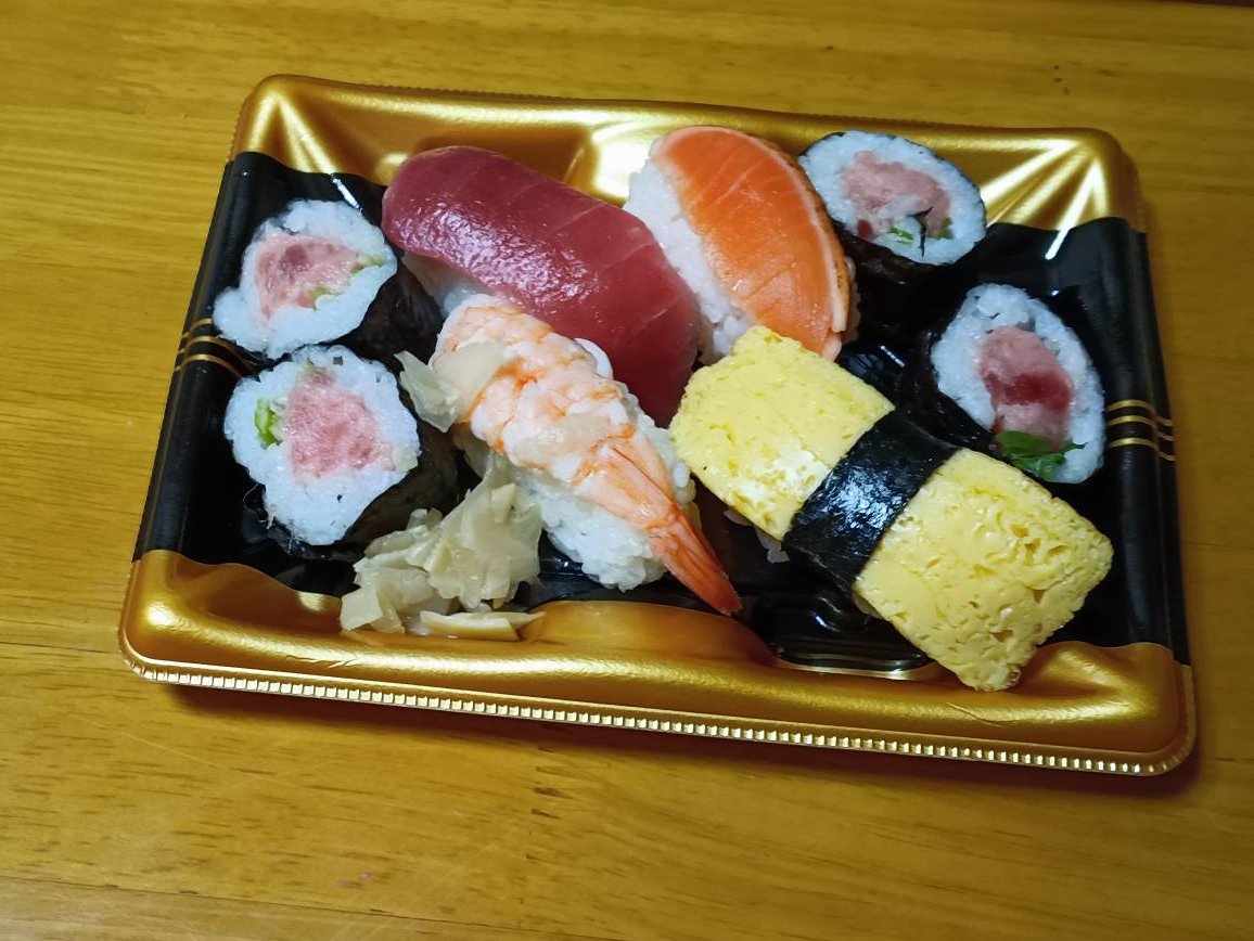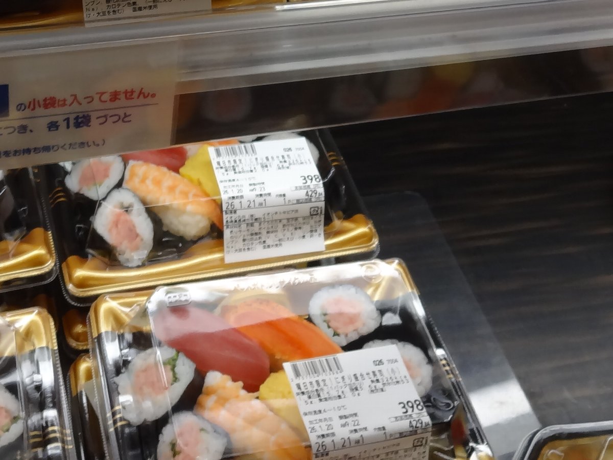 普段はダイレックスやコスモスが安いのですが「火曜市」では「寿司パック」が398円税別や