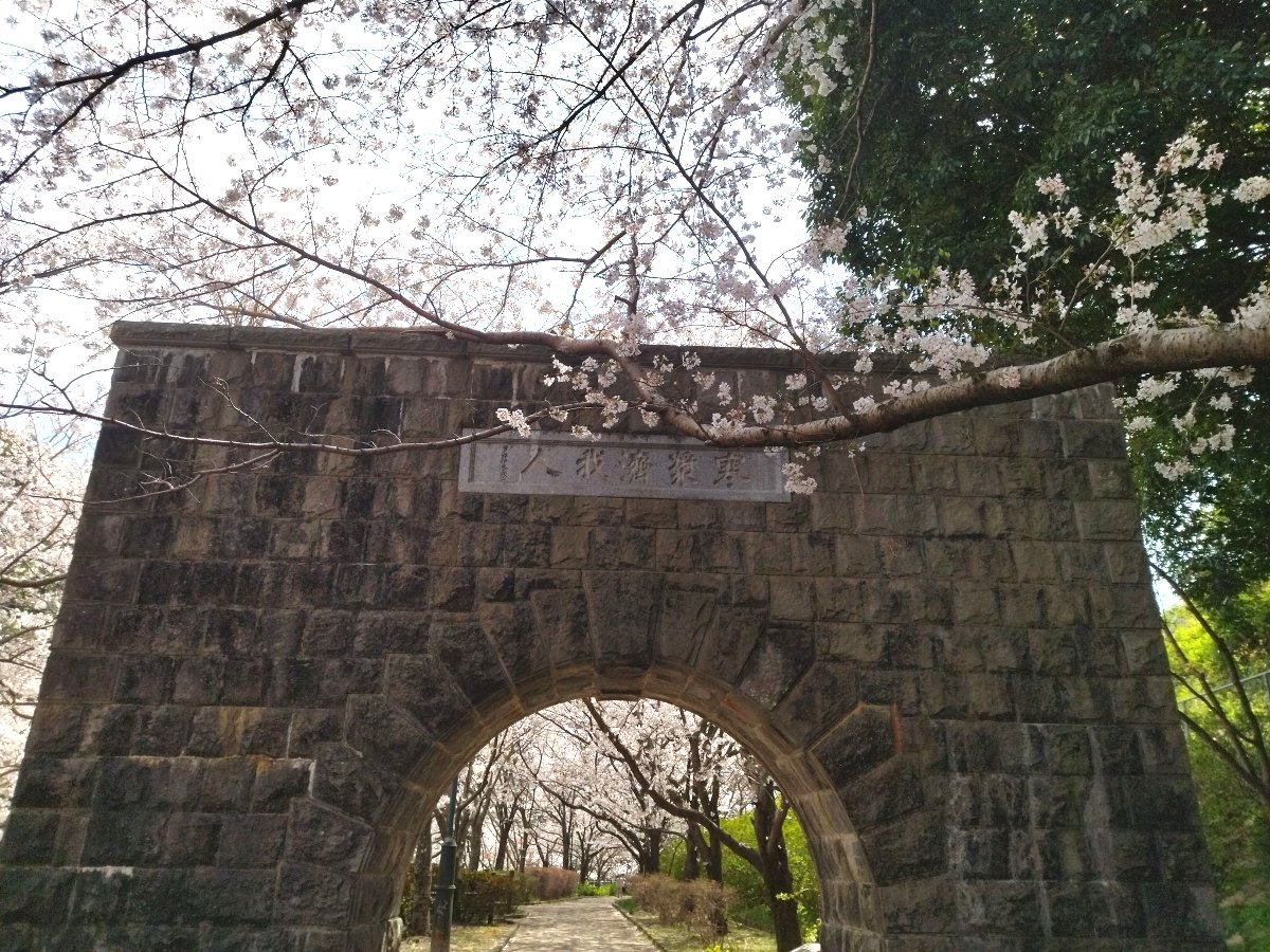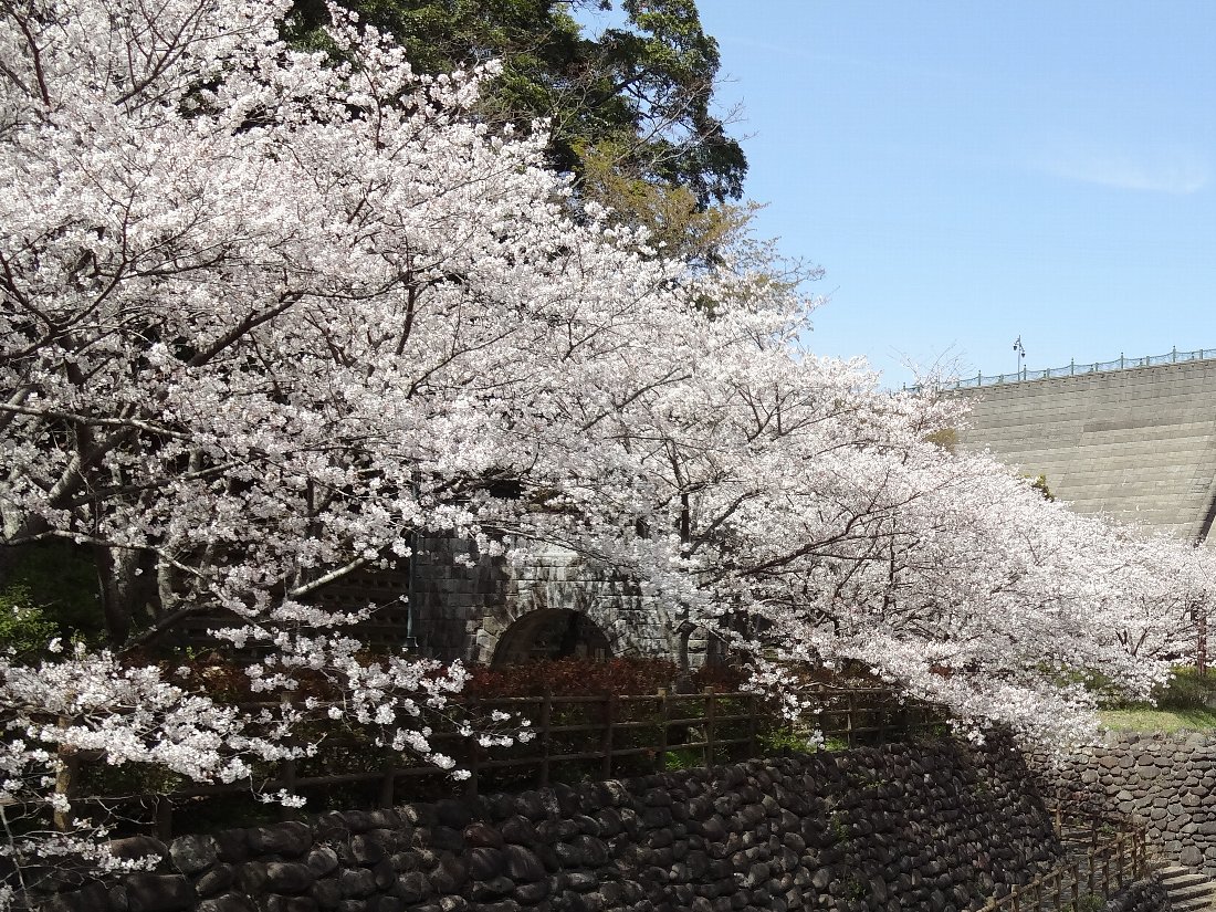 橋を戻って先ほどの桜並木を進むと石門があり「寒奨濟我人(かんしょうさいがじん)」の文字が・・・調べると1904年(明治37)に完成した旧・西山ダムの堤体の銘板に刻まれた文字で意味は「どんなに寒いときでも、市民のために水を汲んであげましょう」だそうです・・・この事業に奔走した伊東巳代治(いとうみよじ)という人を顕彰するために建てられたそうです
