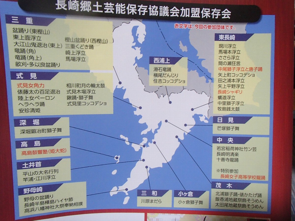 でもリーフレットに載っている「長崎郷土芸能保存協会加盟保存会」の一覧表はでたらめですね・・・とっくの昔に途絶えてしまった「中里獅子浮立」「式見里・コッコデショ」「俵藤太の百足退治」「牧島銭太鼓」「北浦獅子踊り・俵かたげ踊」や最近では演じれれていない「芒塚獅子舞」も記されているんですから(-_-メ)