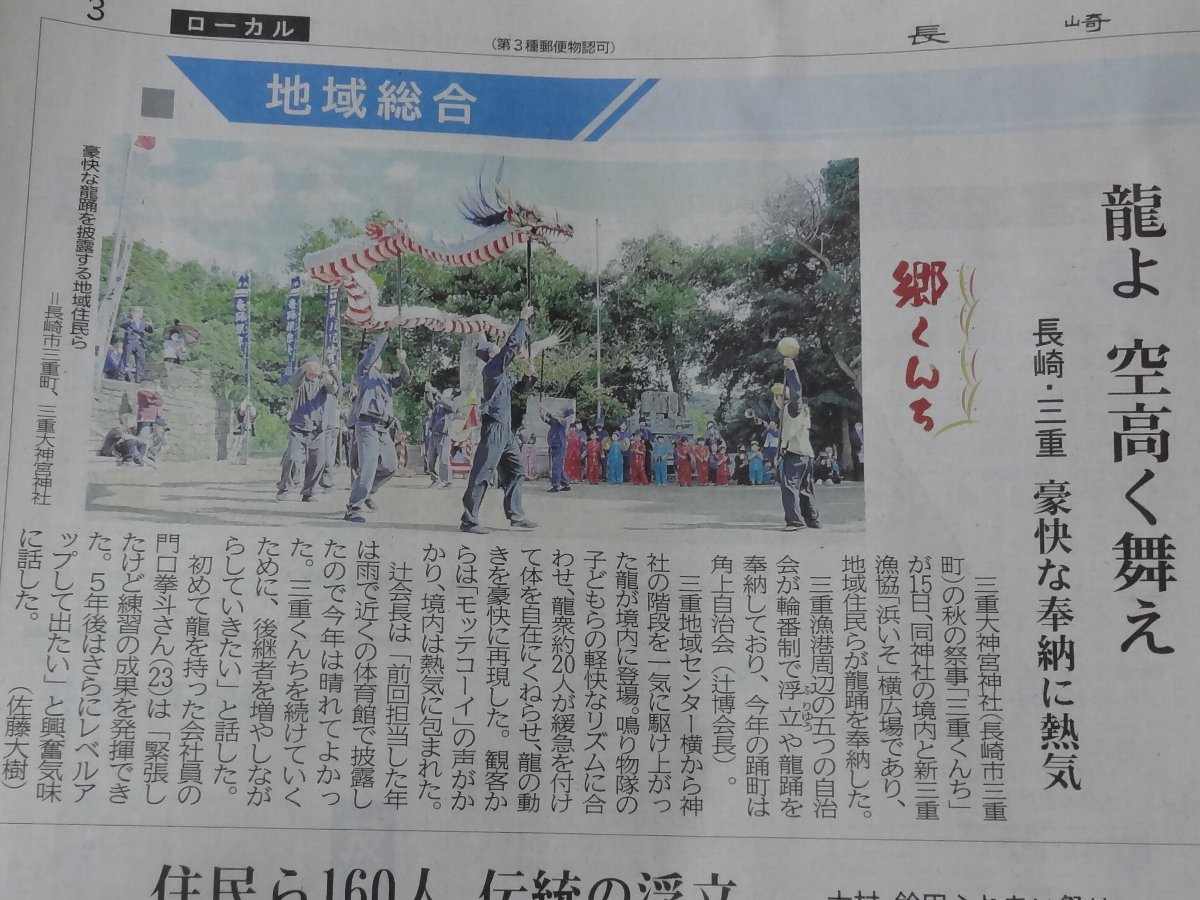 例年だと「竹ン芸」以外の郷くんちが新聞の記事になるなんてほとんどありませんでしたが今日(10/16)の朝刊に昨日の「三重くんち」が取り上げられていますが編集方針が変わったのでしょうか(^^;