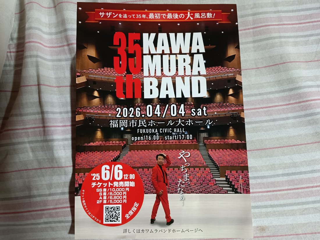 何と「カワムラバンド」は結成35周年だそうで、来年4月に「福岡市民ホール」で記念コンサートを開くとのことです