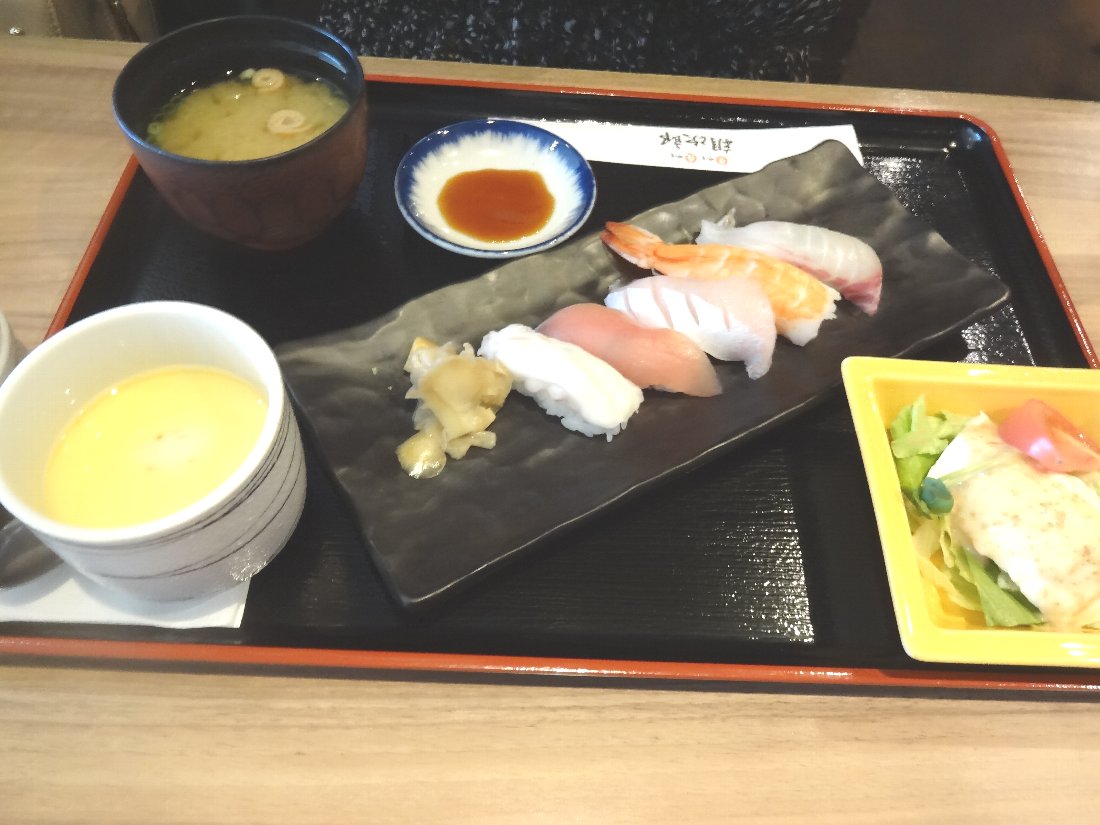 こちらが女房の「寿司5巻セット」ですが「茶碗蒸しやサラダも付いているのでお得」だそうです(^^)