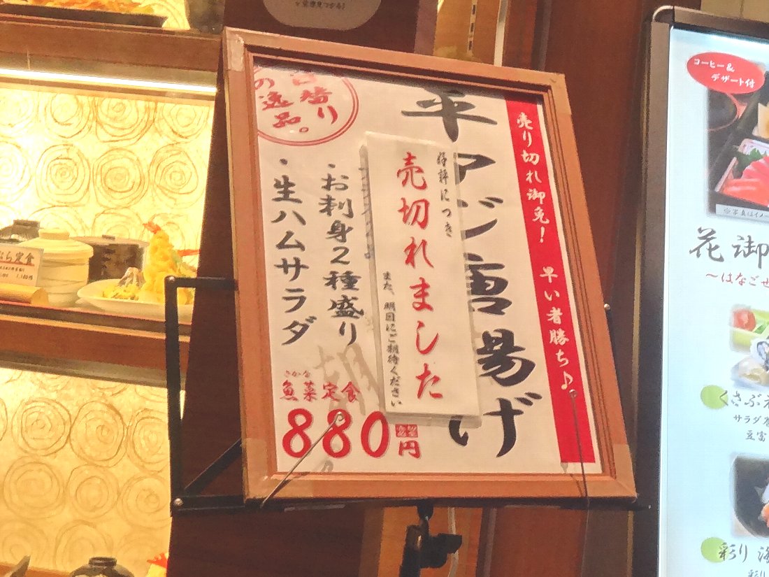 この日の「日替わり」は「アジの唐揚げ」だそうです・・・入店時に写真を撮り忘れたので帰るときに撮影したのですが売り切れになっていました(^^;