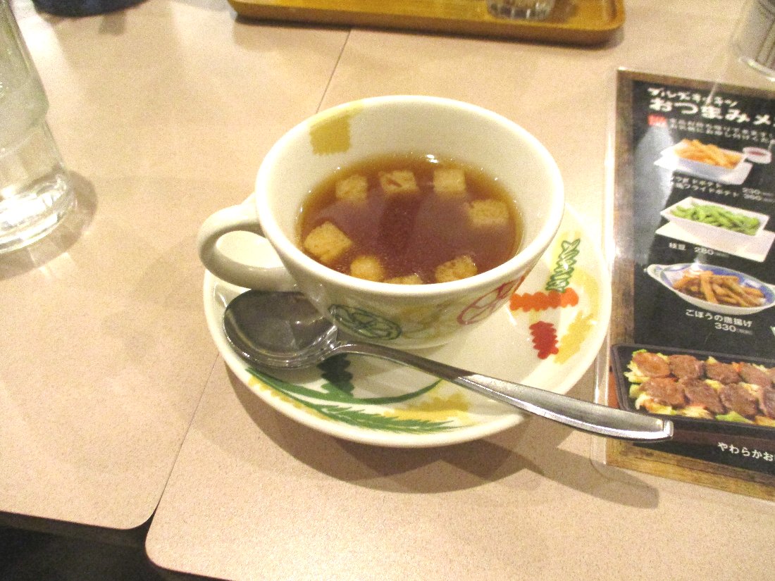 結局私が頼んだのは以前よく食べていた「レモンステーキ」1080円税別です・・・まずは「オニオンスープセット」の「オニオンスープ」がやってきましたがこれはなかなか美味しかったですね
