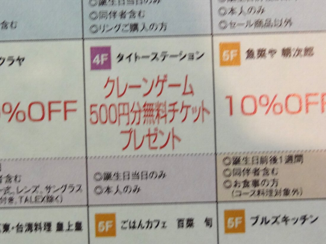 ゲームコーナーの「クレーンゲーム500円分無料チケット」だけみたいですね